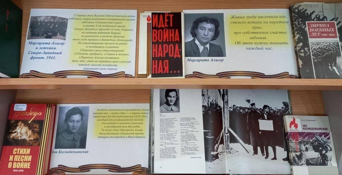 В библиотеке оформлена экспозиция к 110-летию Маргариты Иосифовны Алигер. Сборники стихотворений «Памяти храбрых», «Стихи и поэмы», «Лирика» поэтесса посвятила тем, кто на переднем крае, рискуя погибнуть, защищает свою страну.