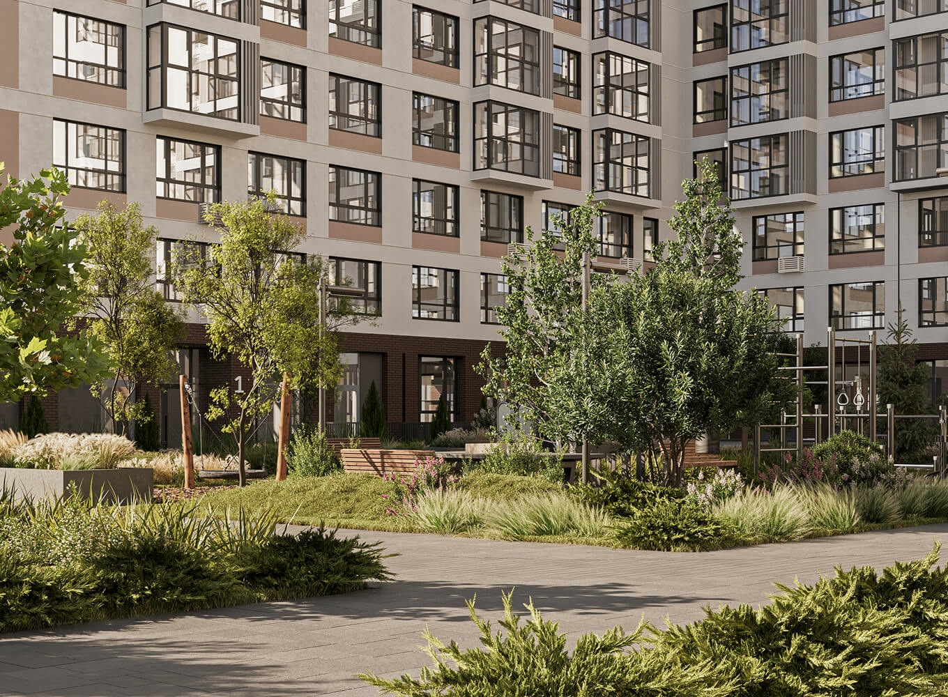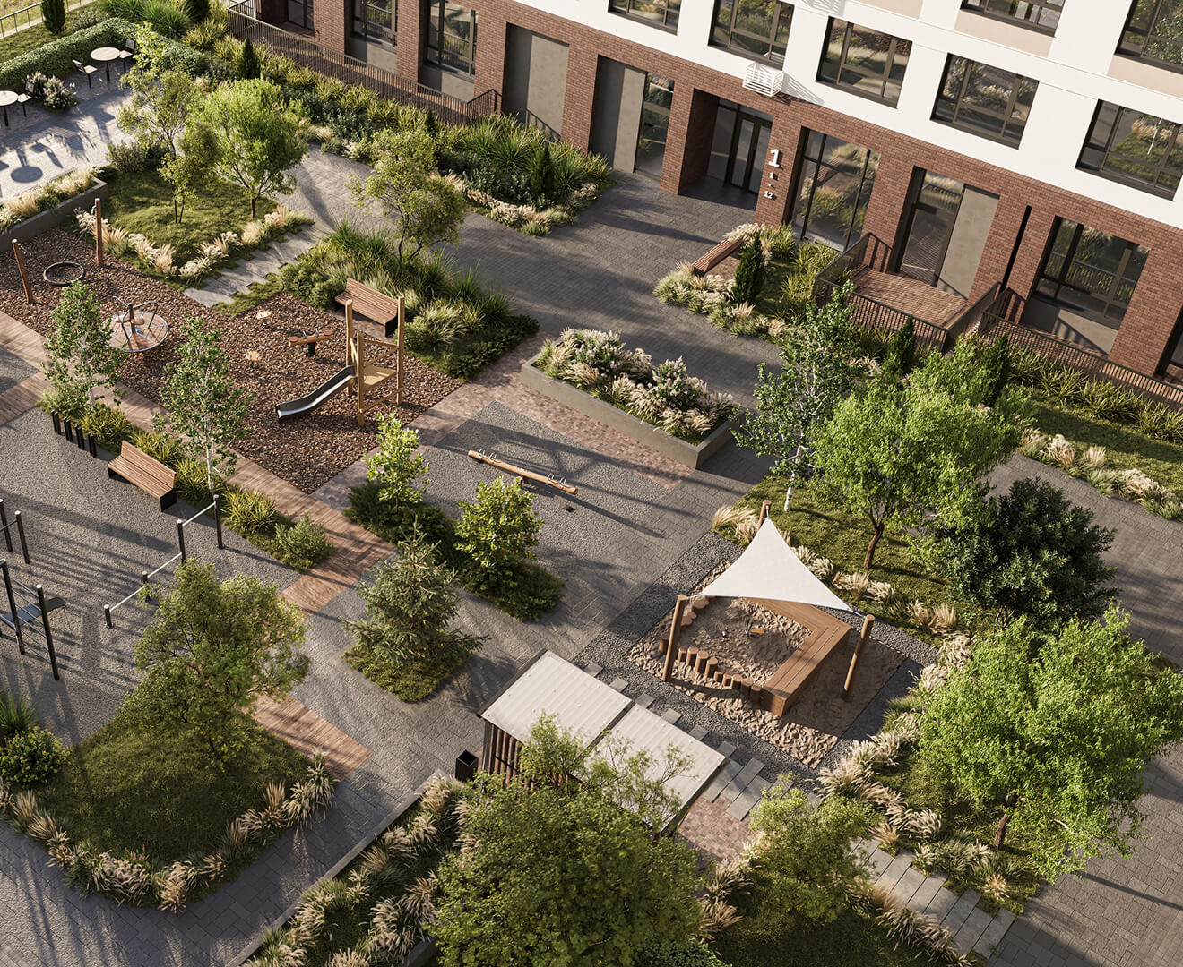 В новом квартале будет закрытая территория с видеонаблюдением, домофон с функцией Face ID, система антиобледенения перед входом в дом. Во дворе жилого квартала не будет машин, здесь предусмотрена подземная парковка. Все это нужно для создания безопасного пространства, где дети и взрослые могут гулять, не беспокоясь о дорожном движении. А еще это экологично: ниже уровень шума и загрязнения воздуха. Для автомобилистов свой плюс — удобно из квартиры спускаться прямо на парковку, и машина всегда защищена от снега, дождя и случайных попаданий мяча.