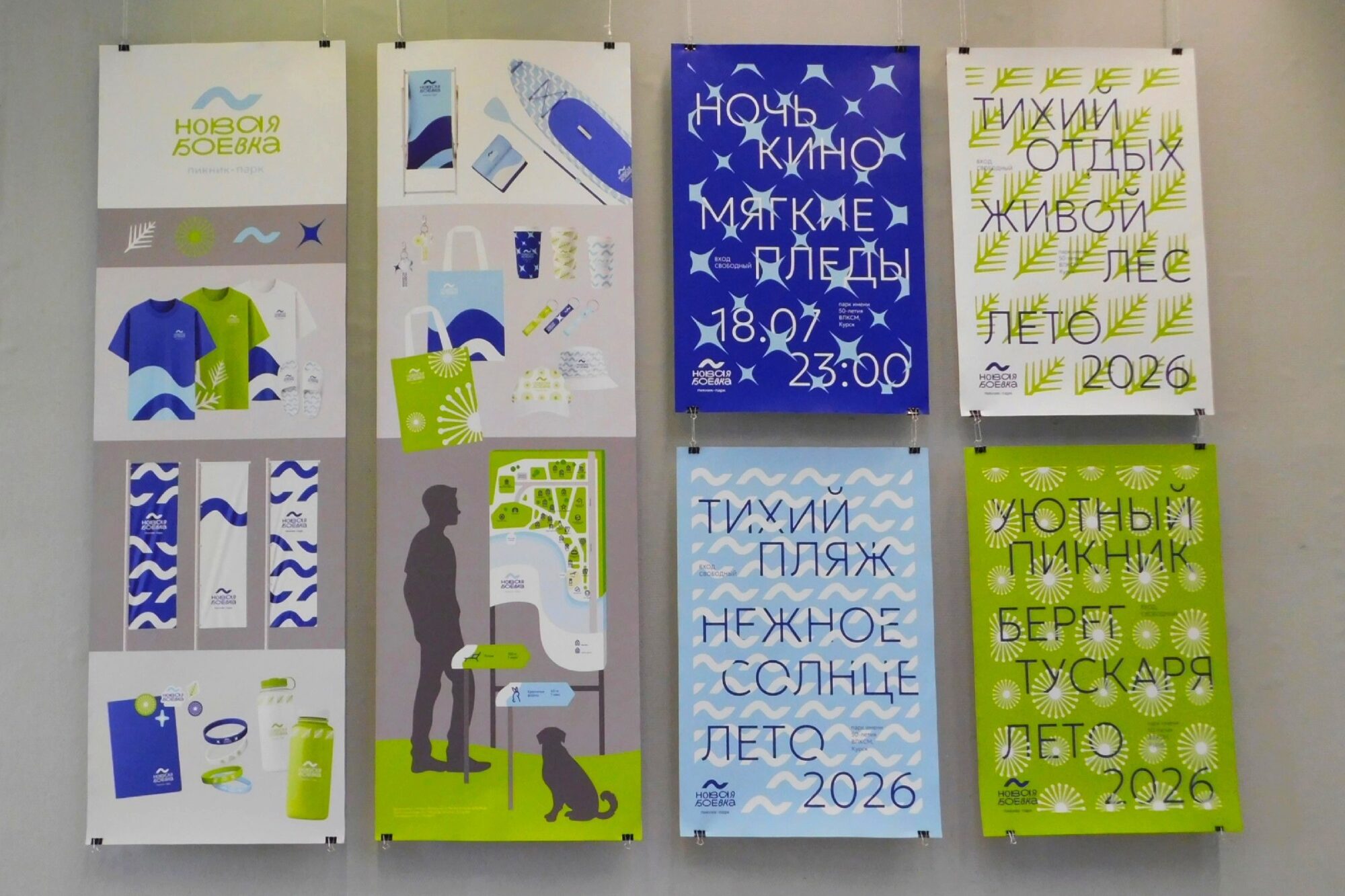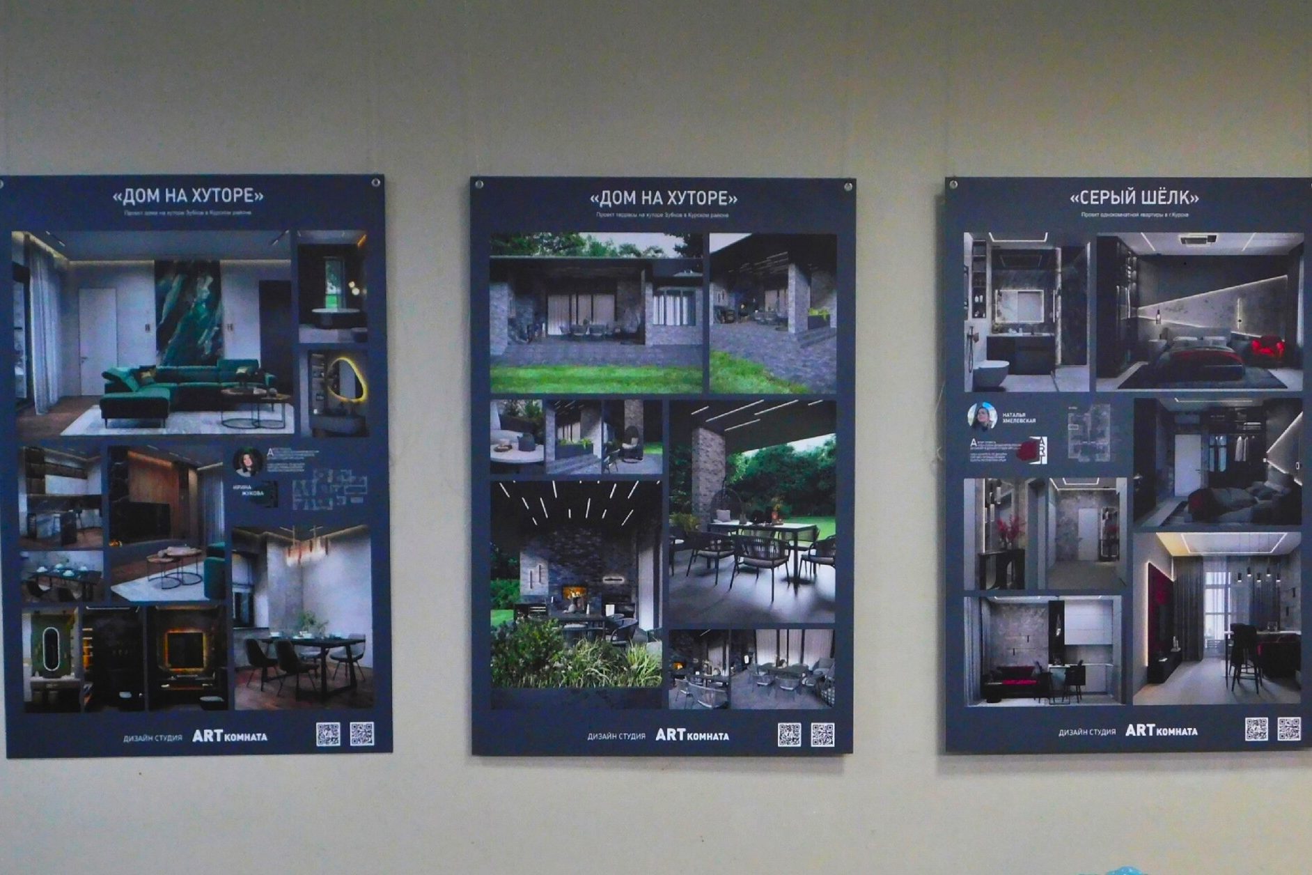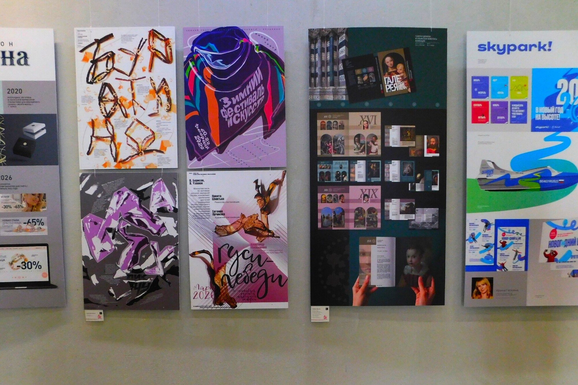 Кроме картин и мозаик, на стенах можно увидеть дизайн-проекты интерьеров, мерч для полугоры и Новой Боевки, макеты рекламных баннеров и другие идеи.