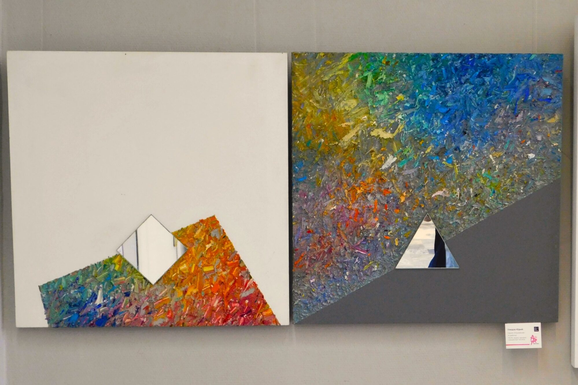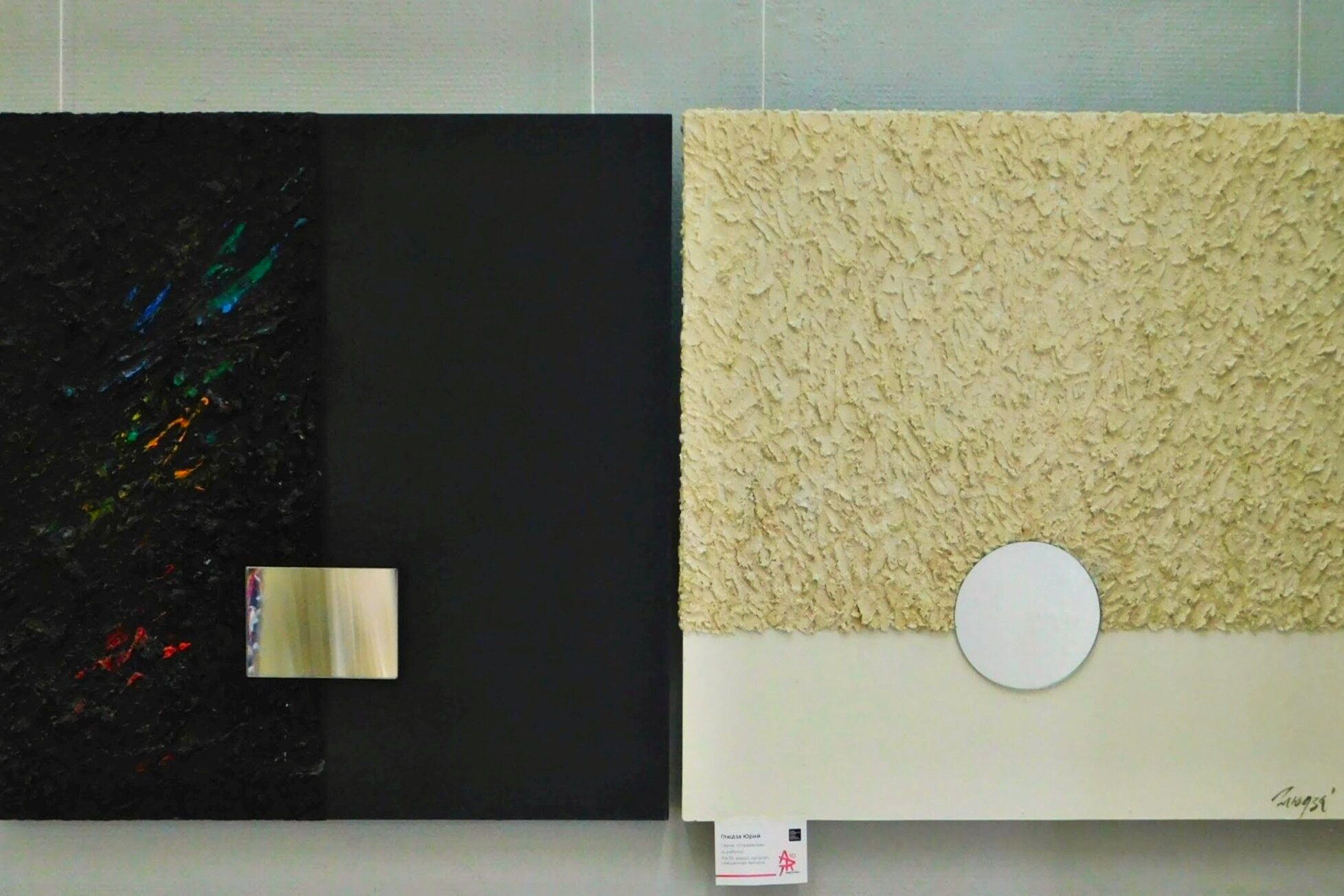 Иное настроение создают четыре картины Юрия Глюдзы под общим названием «Отражение». Сочетание фактур и зеркальных вставок дают ощущение глубины и лёгкой загадочности. Художник пишет акрилом на оргалите и использует густую текстурную краску. Он намеренно соединяет шероховатые мазки с гладкими эмалированными плоскостями. Живописец добивается осязательного контраста и только приветствует желание почувствовать работу кончиками пальцев.