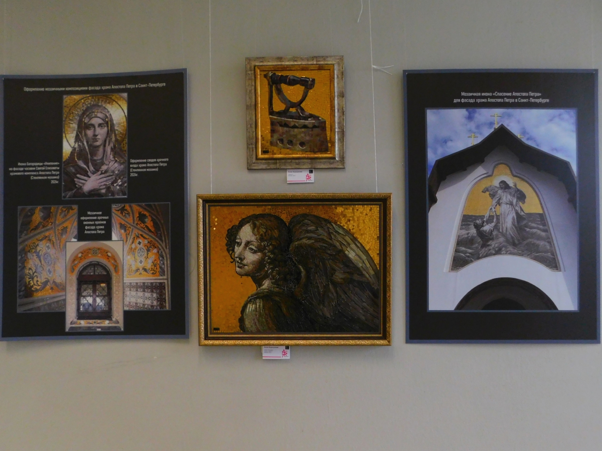Приковывают внимание мозаичные картины Анны Коршуновой — «Ангел Леонардо» и «Раритет». Художница много лет работает в технике архитектурной мозаики. Среди её прошлых проектов — фасадная икона «Спасение Петра» в Петербурге, мозаики храма в деревне Пенино и икона для Антониево-Дымского монастыря. Самая масштабная работа курянки украшает храм Святого Петра на Искровском проспекте. На открытие выставки Анна специально приехала из Санкт-Петербурга.