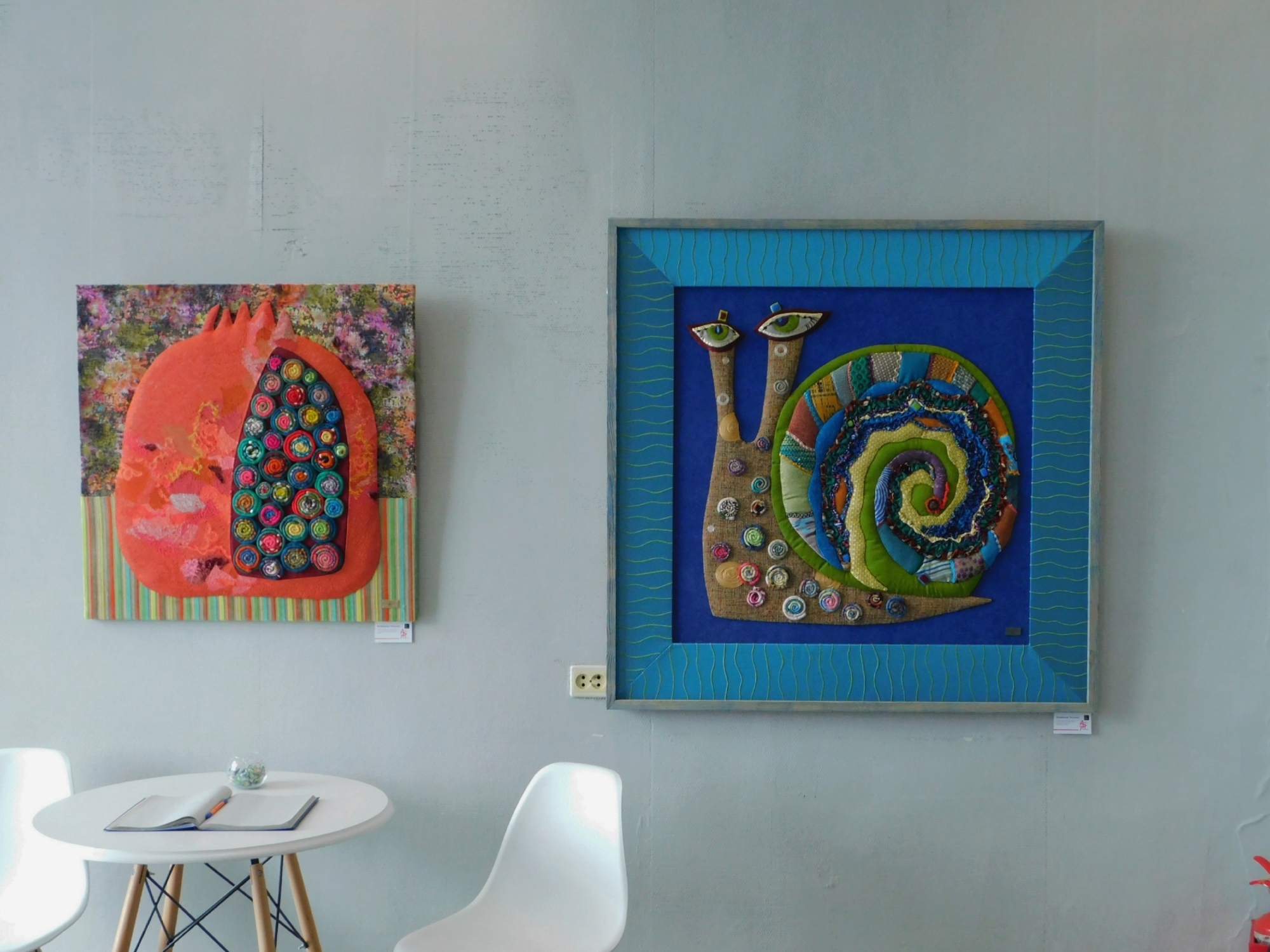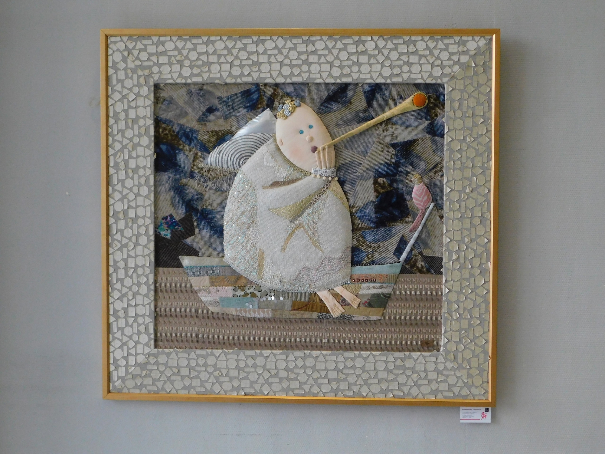 Напротив мозаик Анны Коршуновой — работы Владимира Тельных. Художник работает в технике лоскутного шитья и создает картины из текстиля, кружева и декоративных элементов. В свои композиции он добавляет бусины, бисер, кусочки стекла и металла. Каждая деталь сначала проходит обработку и только потом занимает место в узоре. На выставке можно увидеть три его произведения: «Если бы любовь была такой», «Невинное настроение» и «А мокрый снег падал». Творчество Владимира Тельных знают далеко за пределами страны: его картины побывали в Германии, Франции, Великобритании, Латвии и Беларуси.